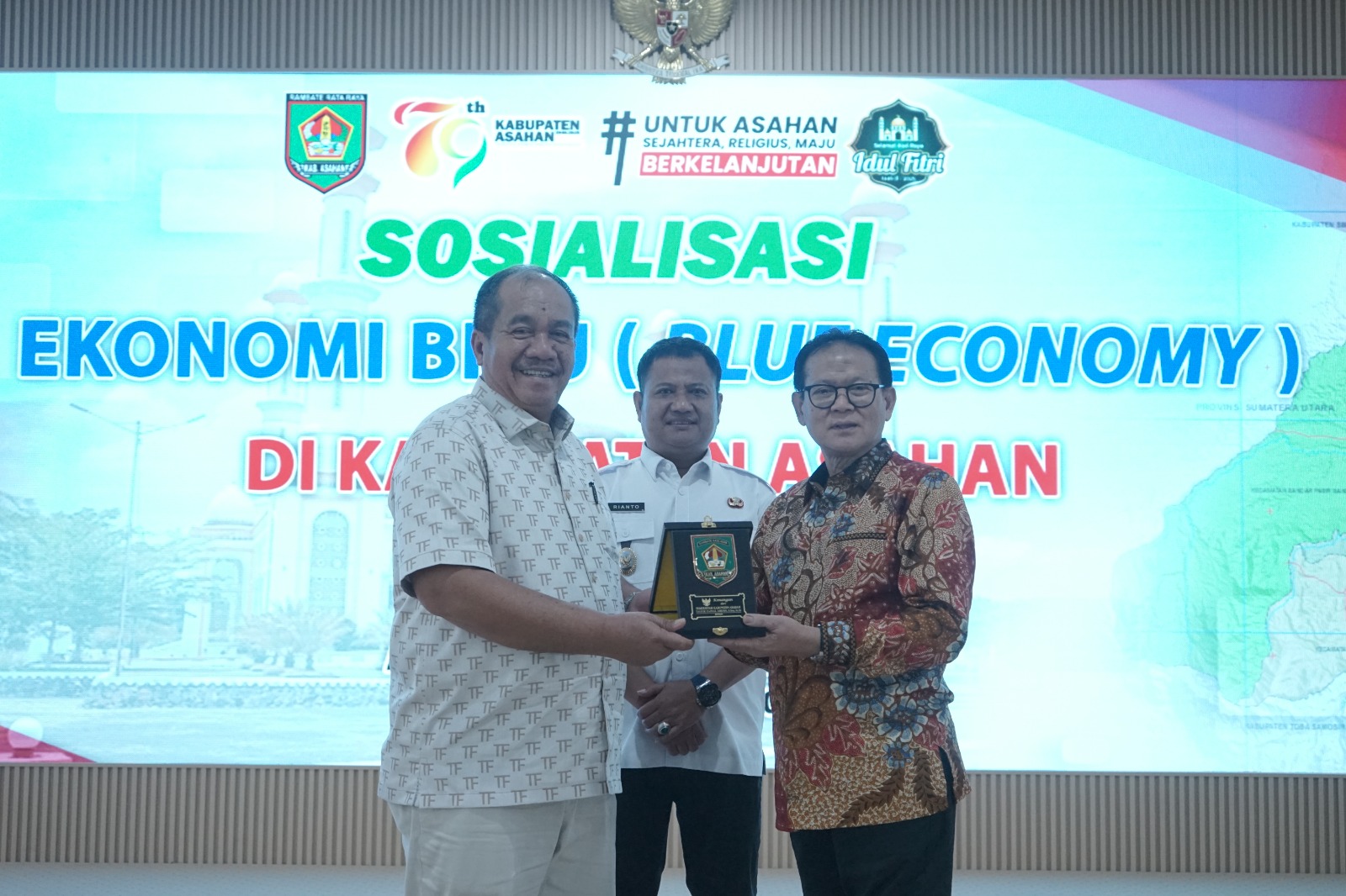 . Keterangan Foto : Bupati Asahan Taufik Zainal Abidin Siregar S.Sos, MSi didampingi Wakil Bupati Rianto SH MAP memberikan cinderamata kepada Anggota Fraksi PDI Perjuangan DPR RI Prof Dr Ir H Rokhmin Dahuri MS dalam acara sosialisasi Ekonomi Biru di Aula Melati Kantor Bupati Asahan, Sabtu (12/04/2025).(gan)