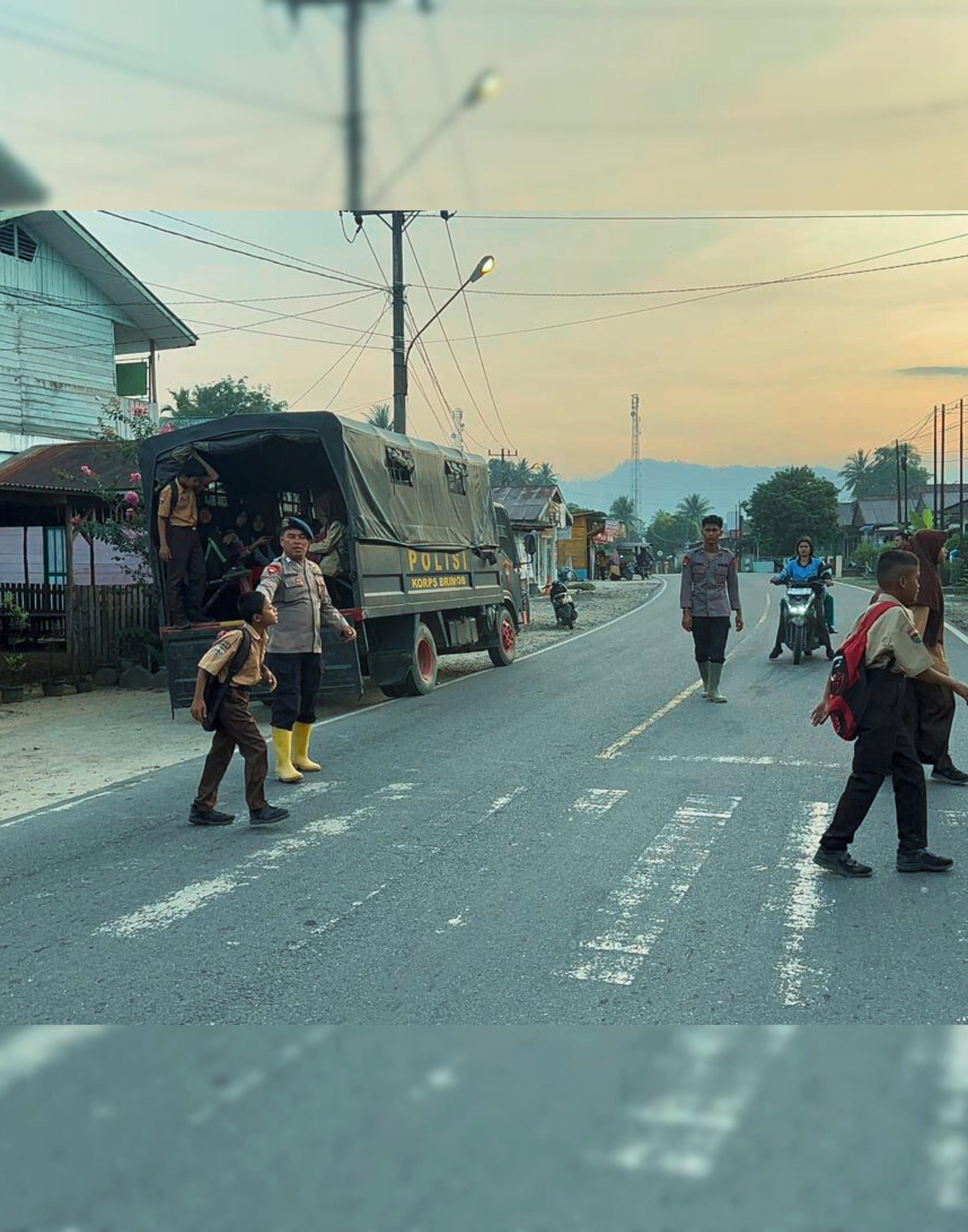 Sebanyak empat personel Brimob terlibat langsung dalam kegiatan tersebut untuk memastikan para siswa dapat berangkat ke sekolah dengan aman dan tepat waktu.