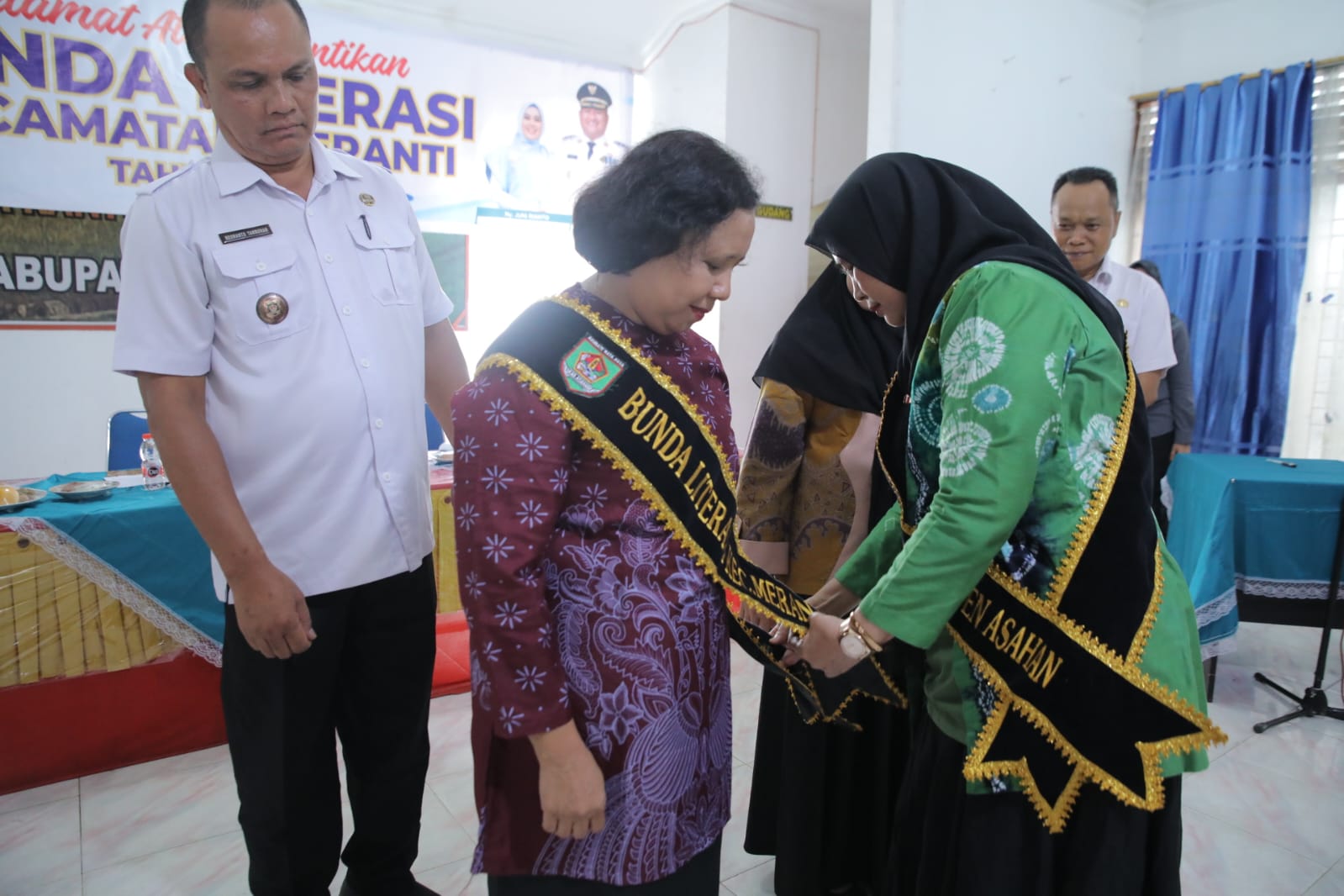Bunda Literasi Asahan Yusnila Indriati Taufik menyematkan selempang Bunda Literasi Kecamatan Meranti dalam acara pelantikan di Aula Kantor Camat Meranti, Rabu (08/04/2026). (gan).