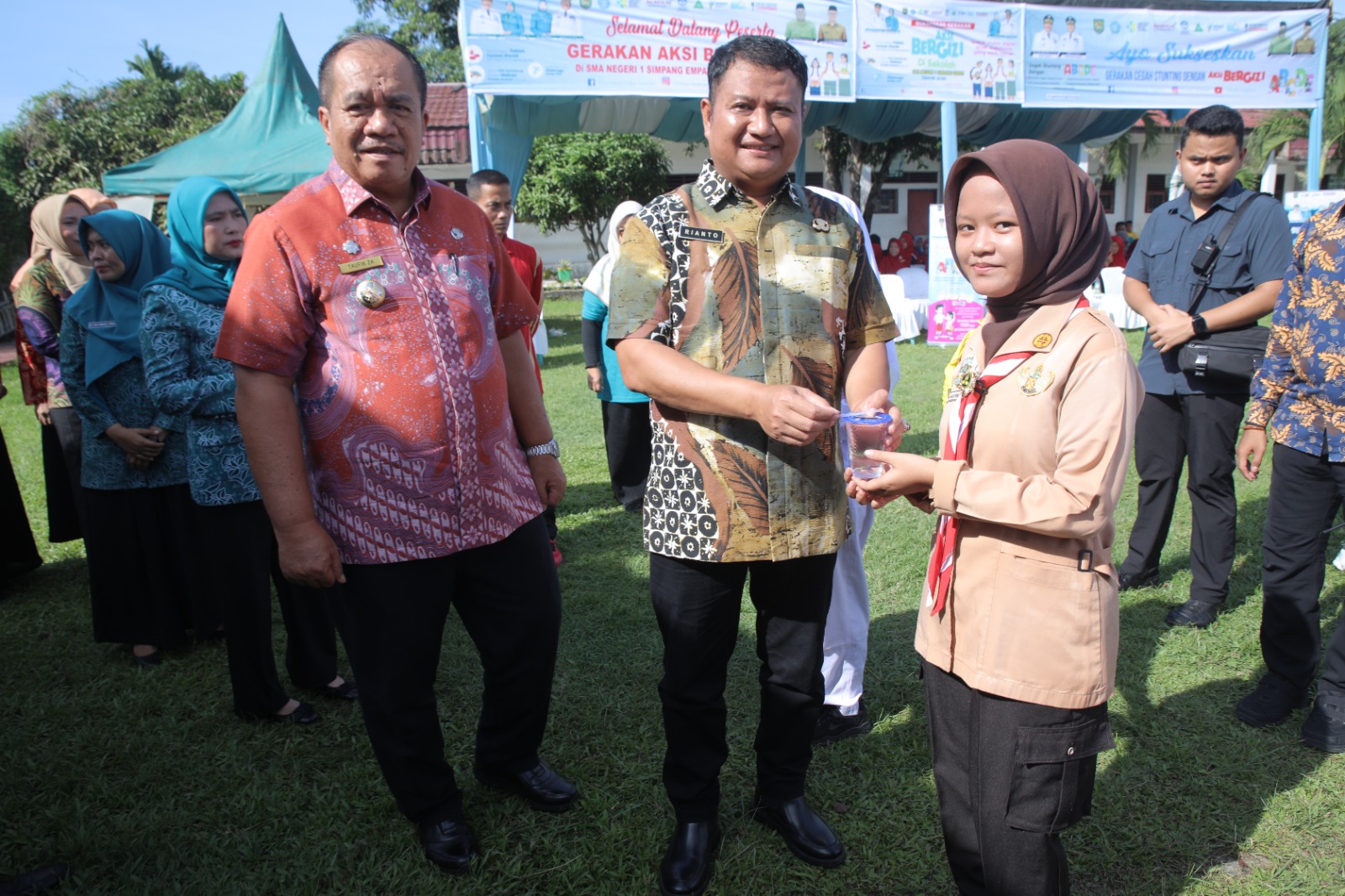 Bupati Asahan Taufik Zainal Abidin Siregar S.Sos, MSi bersama Wakil Bupati Rianto SH MAP menyerahkan tablet tambah darah dalam acara Aksi Bergizi dan pemberian TTD di SMA Negeri 1 Simpang Empat,Kamis (15/05/2025).(gan).
