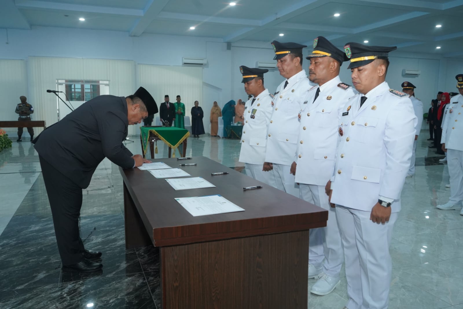 Bupati Asahan Taufik Zainal Abidin Siregar S.Sos, MSi menandatangani berita acara dalam acara pelantikan Pejabat Administrator dan Pejabat Pengawas Pemkab Asahan yang digelar di Aula Melati Kantor Bupati Asahan, Kamis (05/02/2026).(gan).