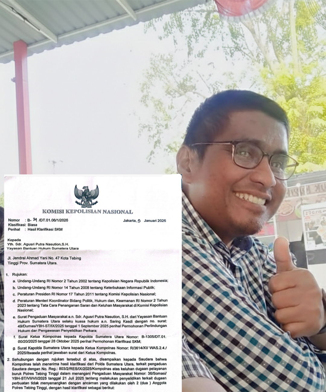 Putra Nasution, yang merupakan advokat dari Yayasan Bantuan Hukum Sumatera Timur (YBH-ST), menyampaikan bahwa pihaknya menghormati hasil klarifikasi yang dikeluarkan Kompolnas sebagai bagian dari mekanisme pengawasan eksternal terhadap institusi Polri.