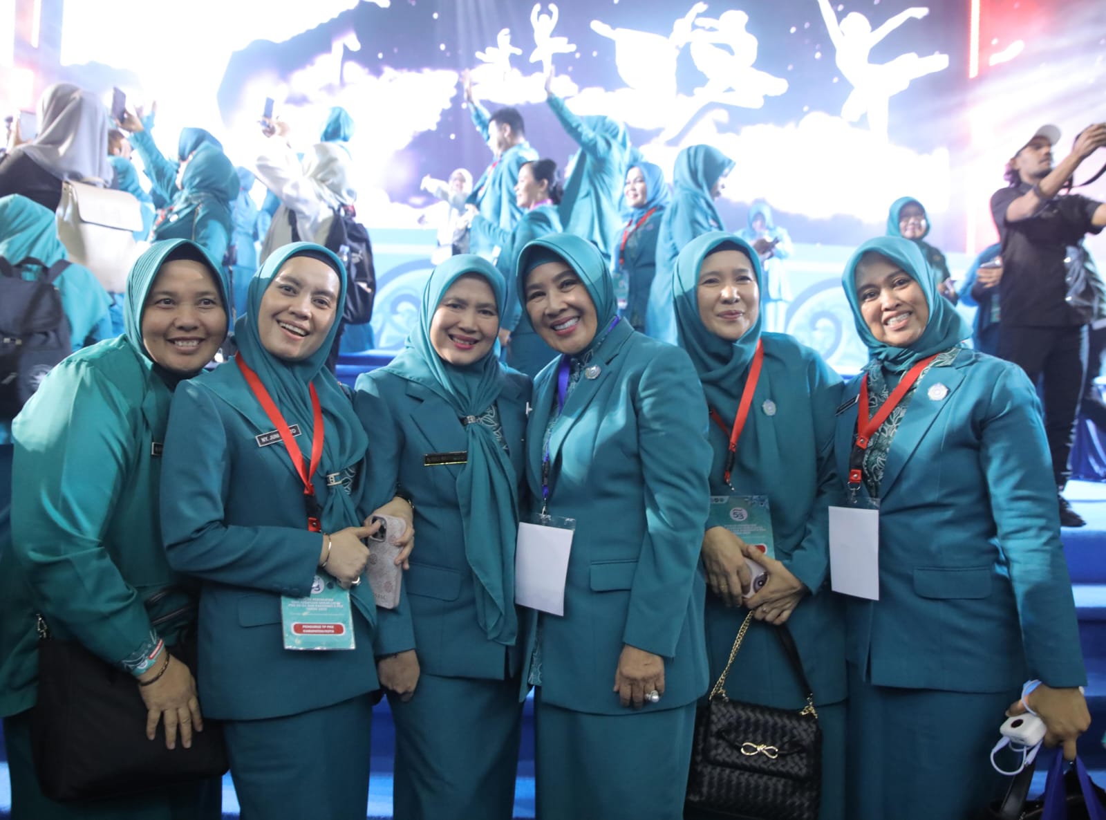 :Ketua TP PKK Asahan Ny. Yusnila Indriati Taufik Zainal Abidin Siregar didampingi unsur pengurus berfoto bersama Ketua Umum TP PKK Pusat Ny Tri Suswati Tito Karnavian dalam acara puncak peringatan HKG PKK ke-53 di Plenary Hall Samarinda Convention Center, Selasa siang (08/07/2025). (gan)