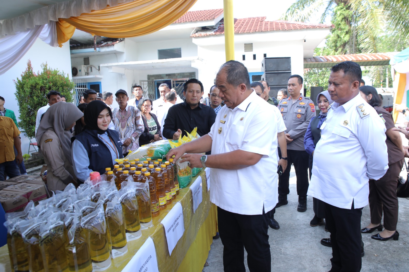 Bupati Asahan Taufik Zainal Abidin Siregar S.Sos, MSi didampingi Wakil Bupati Rianto SH MAP meninjau stand bahan pokok dalam dalam GPM yang digelar di Kantor Camat Kisaran Barat, Rabu (06/08/2025).(gan)