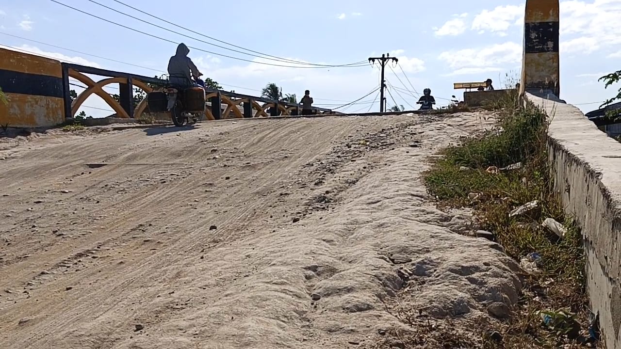 Warga setempat bahkan terpaksa bergotong royong menimbun sisi kiri dan kanan jembatan dengan batu dan tanah agar kemiringan bisa dikurangi.