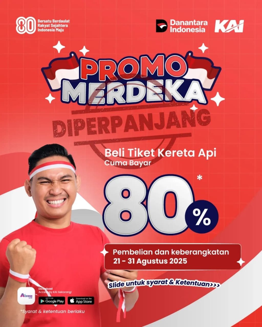 Ia menjelaskan, tiket dengan potongan harga ini dapat dibeli mulai 21 Agustus 2025 hingga sebelum jadwal keberangkatan, melalui aplikasi Access by KAI, situs resmi booking.kai.id, maupun seluruh kanal penjualan resmi tiket KAI.