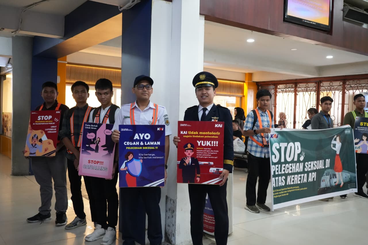 Selain sosialisasi keselamatan, KAI Sumut bersama Komunitas Railfans juga mengadakan kegiatan edukasi anti pelecehan seksual di Stasiun Medan.