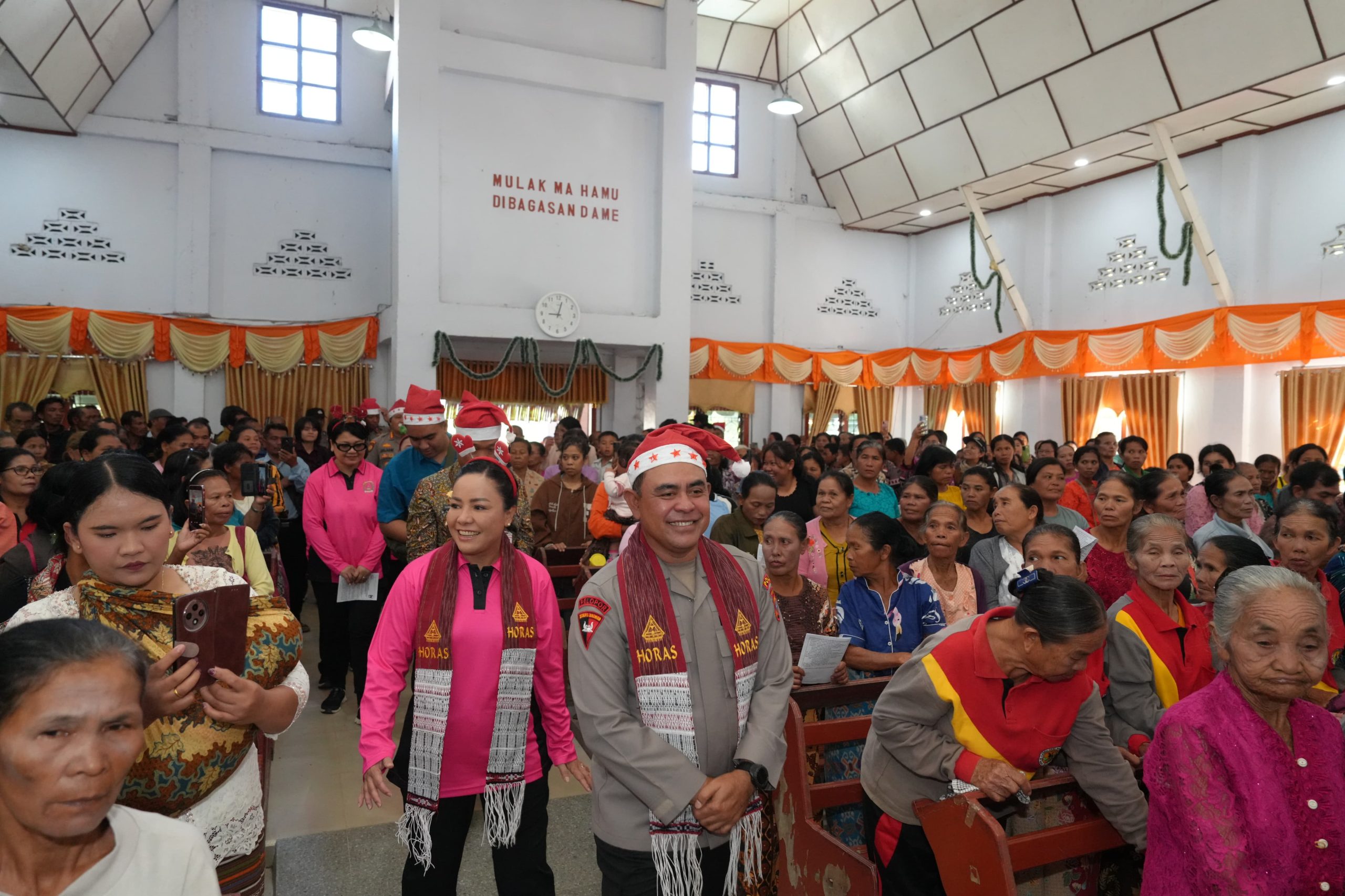 Usai ibadah Natal, Kapolda Sumut dan Ketua Bhayangkari menyerahkan bantuan sosial secara simbolis.