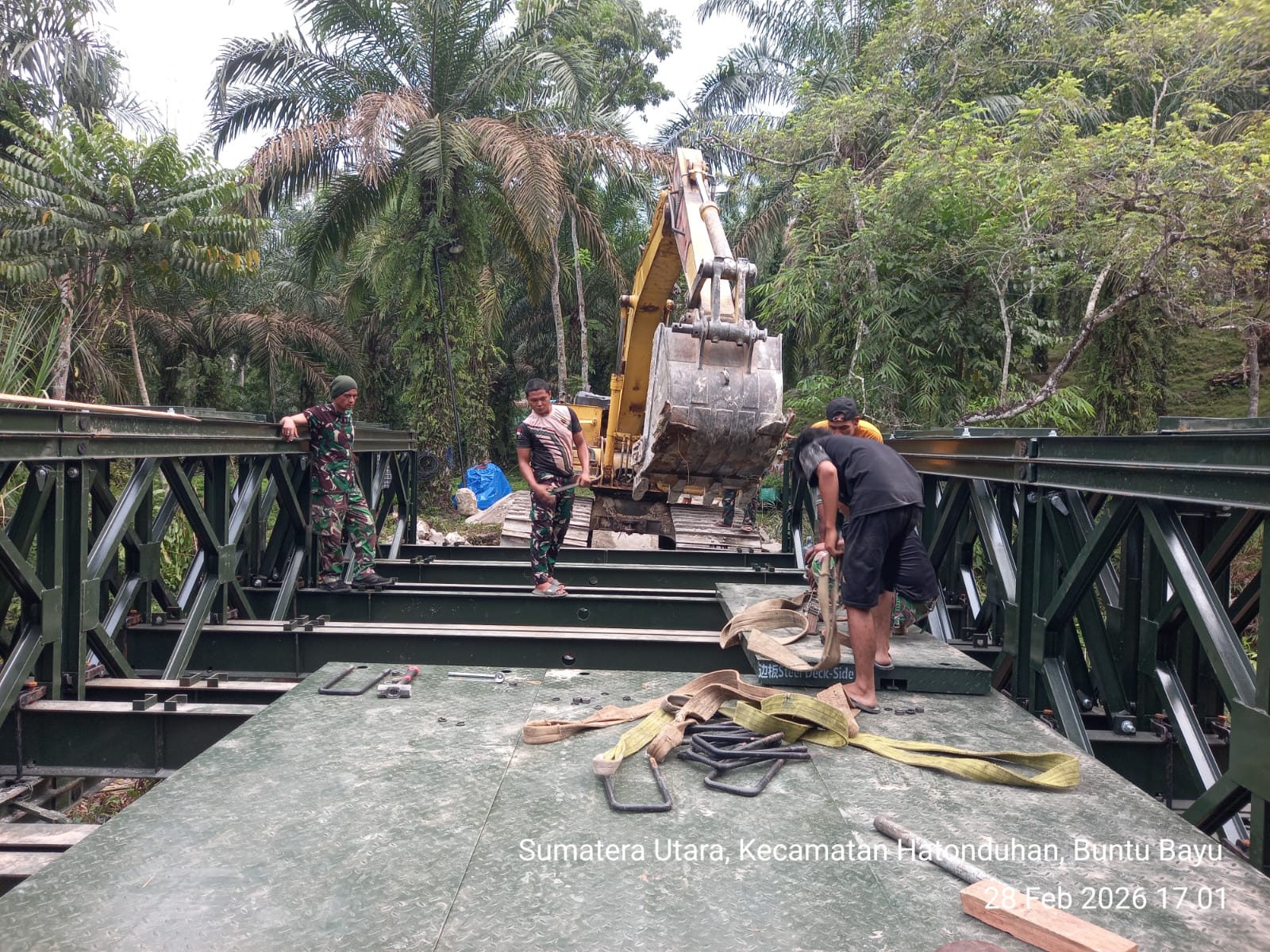 Pengerjaan jembatan dilakukan oleh personel Kodim 0207/Simalungun melalui Koramil 10/Tanah Jawa (TJ) bersama prajurit Yonzipur I/DD dan melibatkan partisipasi aktif masyarakat setempat.