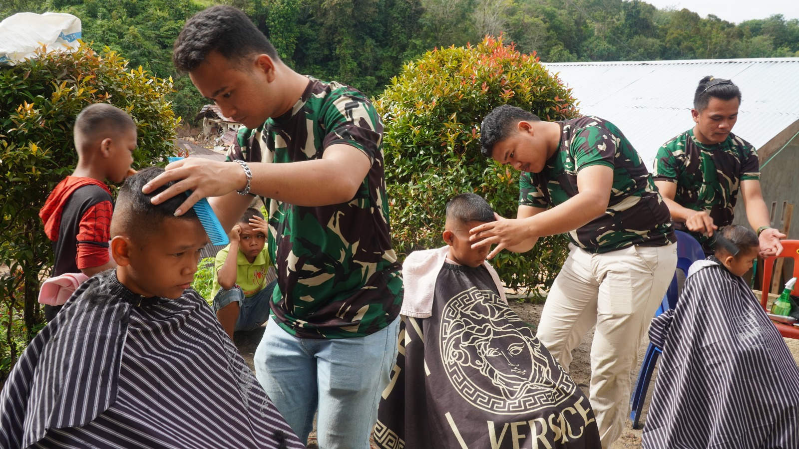 Selain membantu kerapian, kegiatan ini juga menjadi sarana hiburan dan pendekatan emosional bagi anak-anak pengungsi.
