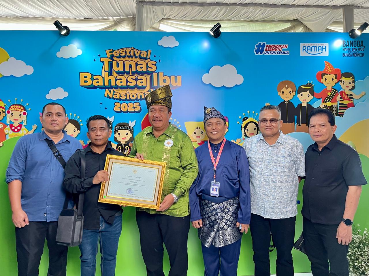 Penghargaan Nasional Apresiasi Kepala Daerah itu diserahkan Menteri Pendidikan Dasar dan Menengah (Mendikdasmen) Prof. Dr. Abdul Mu’ti, M.Ed dalam acara Festival Tunas Bahasa Ibu Nasional (FBIN) di Gedung Merah Putih, Bojongsari, Depok, Jawa Barat, Senin (26/05/ 2025).