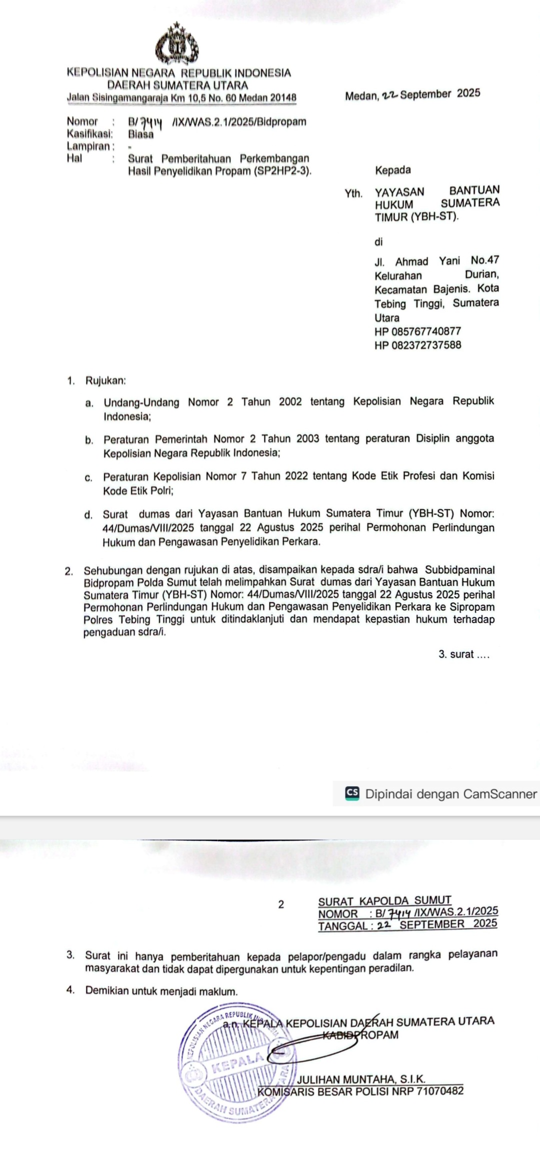 Surat resmi tersebut ditandatangani langsung oleh Kepala Polda Sumut, Kombes Pol Julihan Muntaha, S.I.K., dan ditujukan kepada Yayasan Bantuan Hukum Sumatera Timur (YBH-ST), lembaga yang mendampingi kuasa hukum Pak Saring.