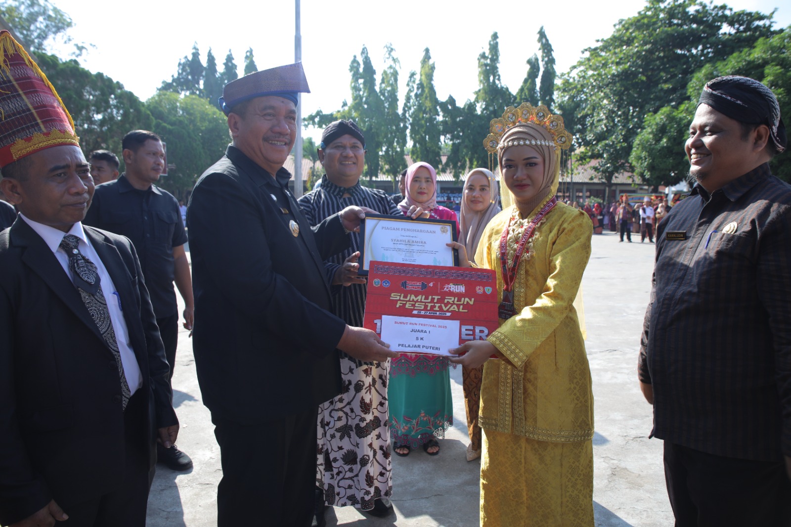 Bupati Asahan Taufik Zainal Abidin Siregar S.Sos, MSi bersama Wakil Bupati Rianto SH MAP menyerahkan penghargaan kepada pelajar putri Juara I Run 5K Sumut Festival 2025 pada acara peringatan Hardiknas yang dilaksanakan di Halaman SMP Negeri 2 Kisaran, Jum'at (02/05/2025).(gan).