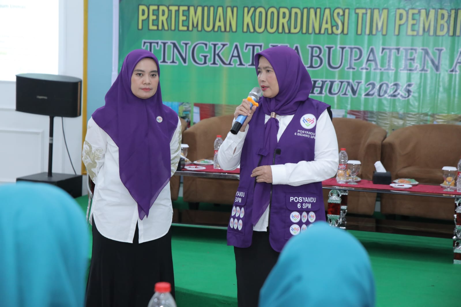 Ketua TP PKK Asahan Ny Yusnila Indriati Taufik didampingi Staf Ahli TP PKK Ny Juni Rianto ketika menyampaikan arahannya dalam acara sosialisasi penerapan 6 SPM Kader Posyandu yang digelar di Aula Hotel Antariksa Kisaran, Rabu (10/12/2025).(gan).