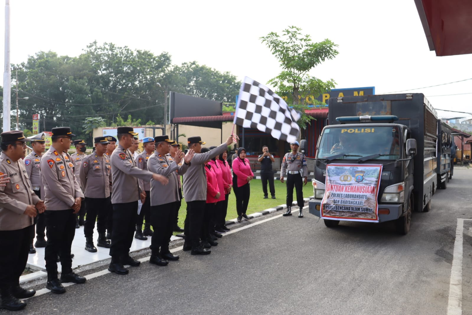 Pelepasan bantuan dipimpin langsung Kapolres Labuhanbatu AKBP Choky Sentosa Meliala, S.I.K., S.H., M.H., di Lapangan Apel Mapolres Labuhanbatu, Jalan MH. Thamrin, Rantau Utara, Rabu (3/12/25).