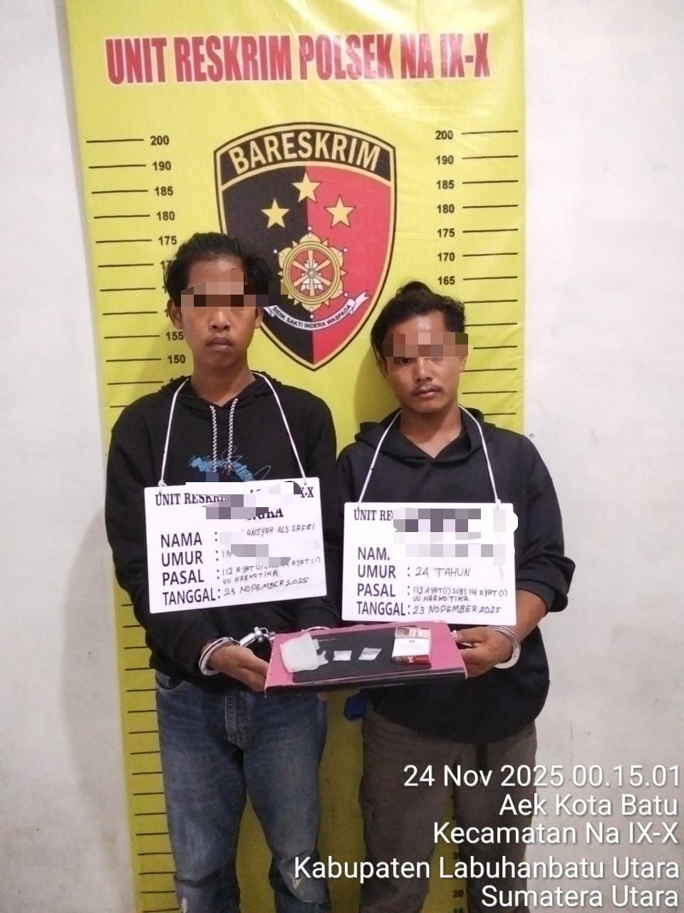 COM, LABUHANBATU — Upaya Polsek NA IX-X dalam memberantas narkotika kembali membuahkan hasil. Dua pemuda diamankan pada Minggu (23/11/2025) di Lingkungan V Aek Tampang, Kelurahan Aek Kota Batu, Kecamatan NA IX-X, Kabupaten Labuhanbatu Utara, setelah kedapatan membawa paket sabu. Penangkapan ini disampaikan Senin (24/11/2025).