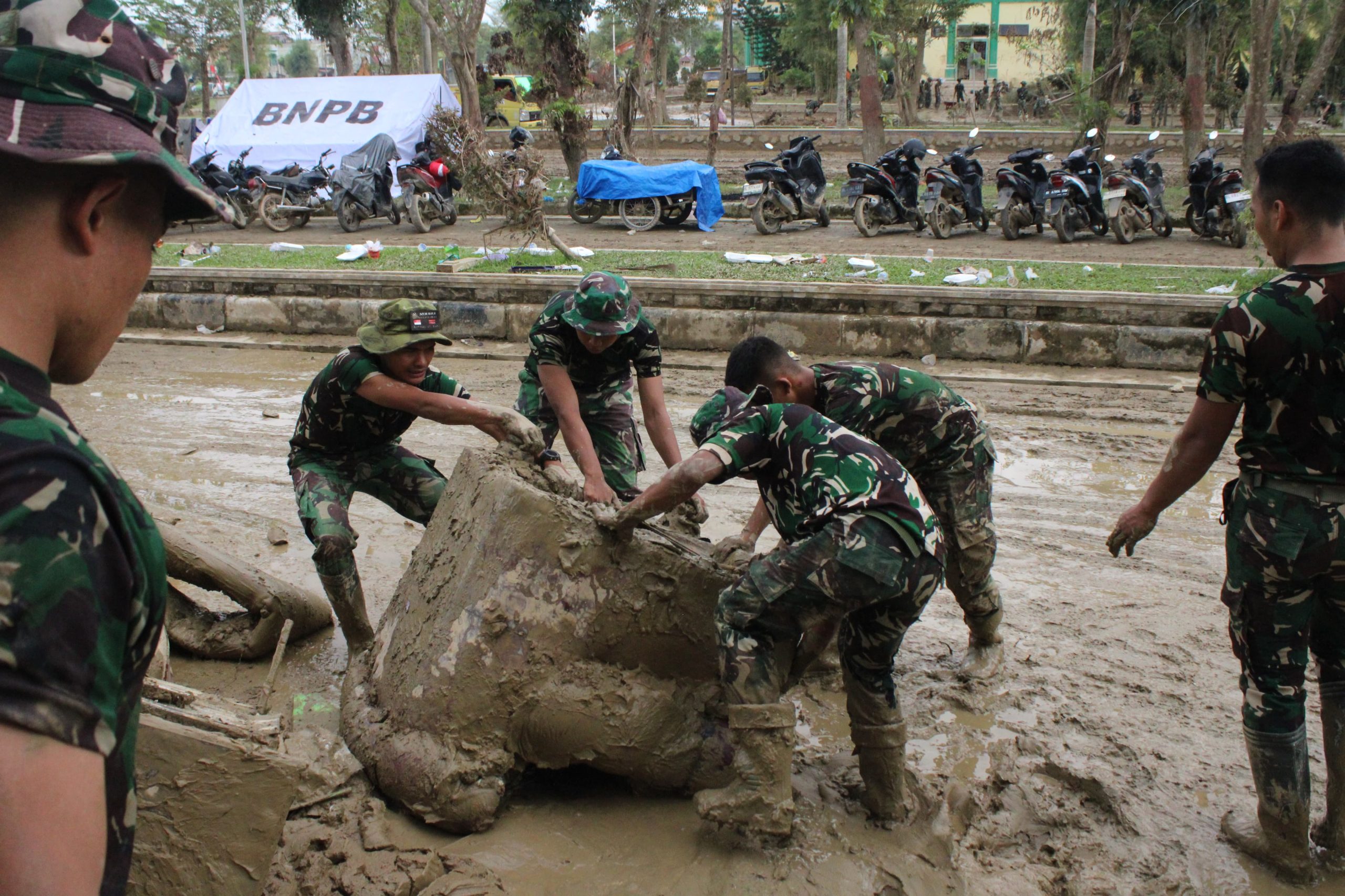 TERITORIAL24.COM, ACEH TAMIANG — Prajurit Batalyon Infanteri TP 852/Abhinaya Bala Yudha melaksanakan tugas Satuan Tugas Pemulihan di Kabupaten Aceh Tamiang, Aceh.