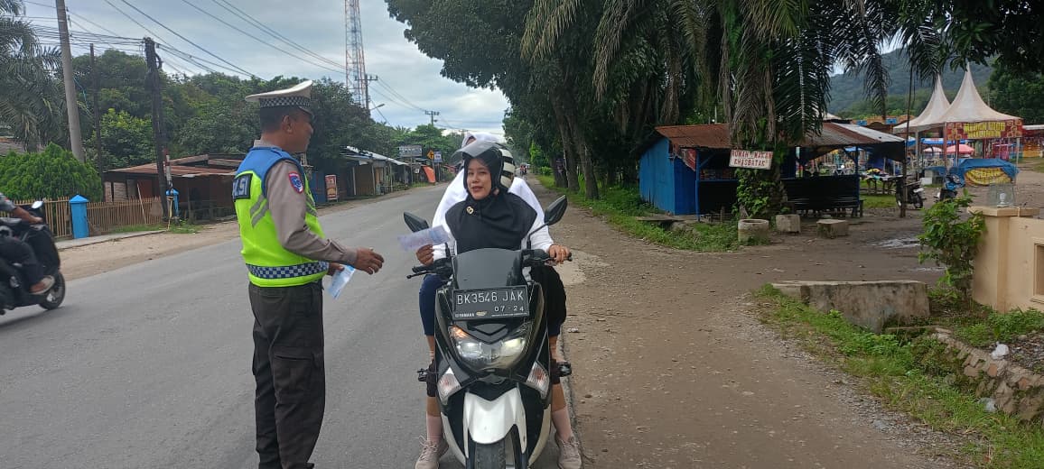 Petugas turun langsung ke Jalinsum depan Polsek Aek Natas, Kabupaten Labuhanbatu Utara, membagikan brosur keselamatan sebagai bagian dari Operasi Zebra Toba 2025 yang berlangsung 17–30 November.