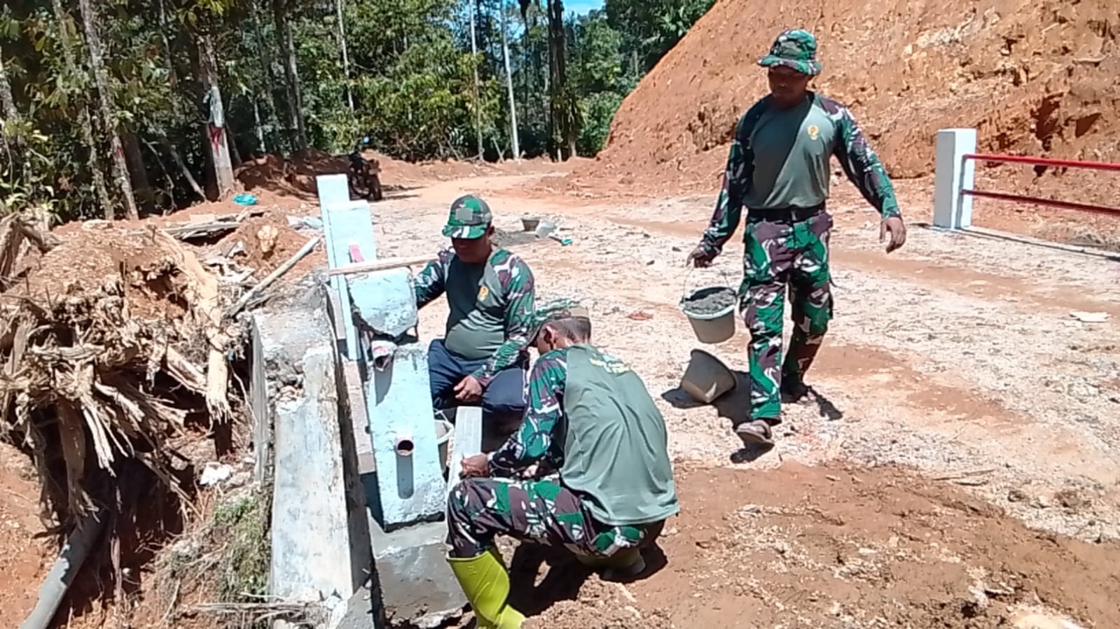 Selain pekerjaan utama pada struktur jembatan, personel Satgas juga melaksanakan pembersihan alur sungai dari material tanah dan batu, pembuatan slop sebagai penguat tebing, serta pembangunan pion jembatan guna meningkatkan ketahanan konstruksi terhadap arus air.