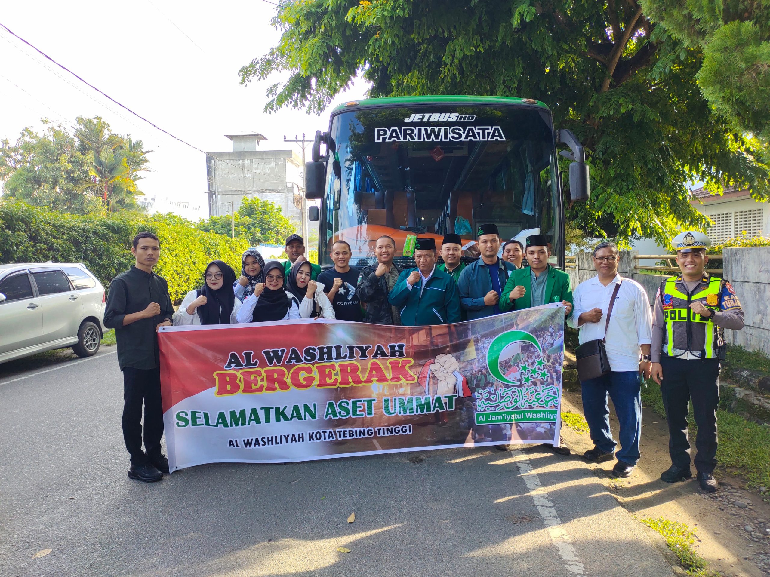 Terpantau warga dan kader Al Washliyah tebing tinggi menaiki 1 bus bergerak mulai dari pukul 08.00 wib dari kota tebing tinggi di kawal personil polres tebing tinggi.