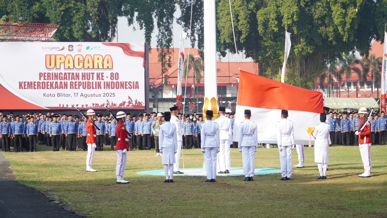 TERITORIAL24.COM, BLITAR – Peringatan HUT ke-80 Republik Indonesia di Alun-Alun Kota Blitar berlangsung meriah dan khidmat, Minggu pagi (17/8/2025).