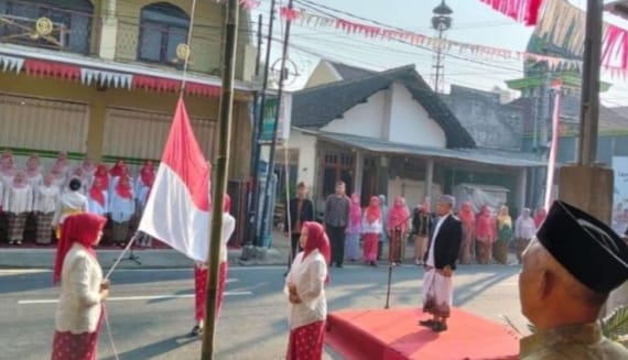 Jalanan yang biasanya ramai dilewati warga, pagi itu ditutup sementara dan disulap menjadi tempat penuh khidmat. Bendera Merah Putih berkibar gagah di antara deretan rumah, sementara ratusan warga dari berbagai usia berdiri tegap menyanyikan lagu kebangsaan dengan penuh semangat. Atmosfer sederhana tapi menggetarkan.