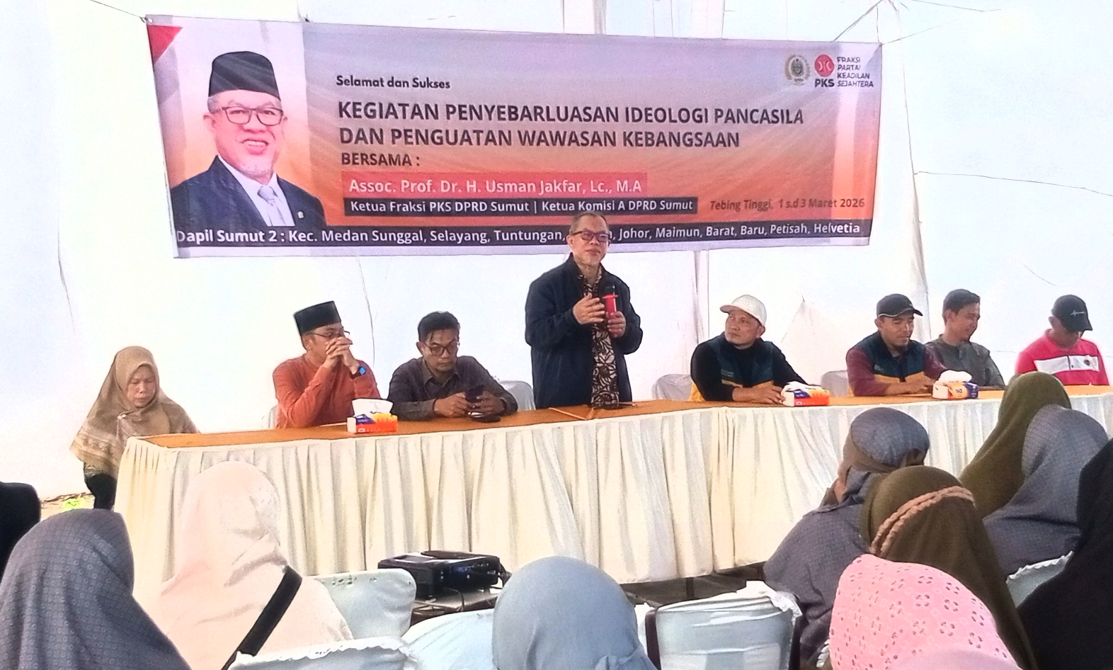 TERITORIAL24.COM,‎TEBING TINGGI – Ketua Fraksi PKS sekaligus Ketua Komisi A DPRD Sumatera Utara, Assoc. Prof. Dr. H. Usman Jakfar, Lc., M.A., menegaskan bahwa nilai-nilai luhur Pancasila harus ditransformasikan dari sekadar teks menjadi solusi konkret atas berbagai krisis sosial di Sumatera Utara.