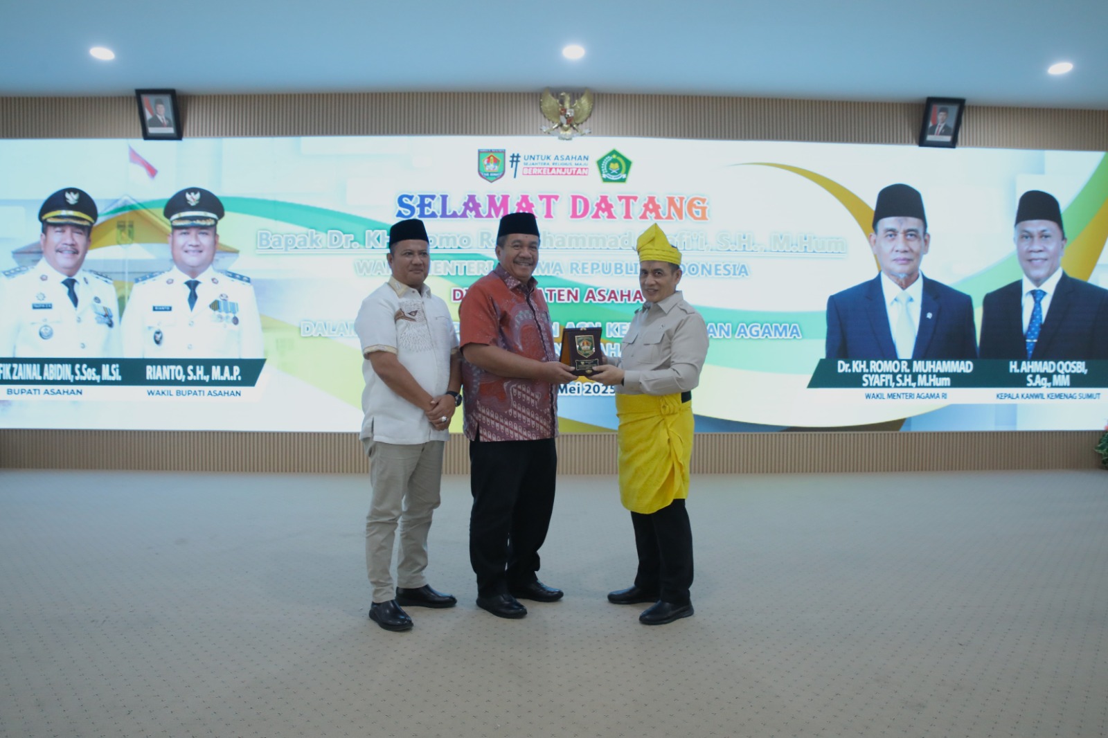 Bupati Asahan Taufik Zainal Abidin Siregar S.Sos MSi didampingi Wakil Bupati Rianto SH MAP menyerahkan cindera kepada Wakil Menteri Agama Dr KH Romo R Muhammad Syafi'i SH MHum dalam acara penyambutan di Aula Melati, Kantor Bupati Asahan, Sabtu (03/05/2025).(gan).