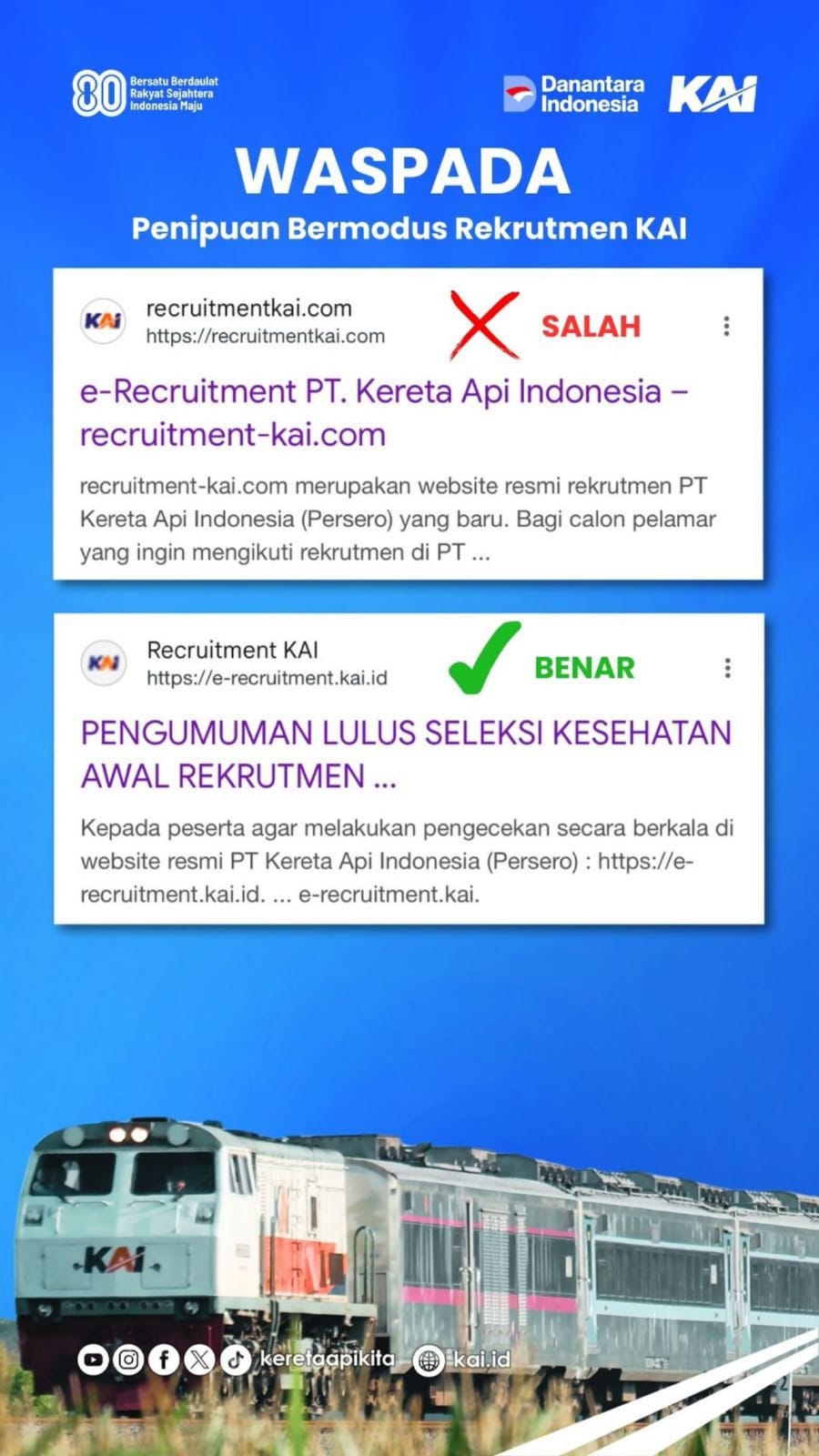 Kami ingatkan kembali, KAI tidak memiliki kanal lain dalam proses rekrutmen. Seluruh informasi resmi hanya berasal dari website tersebut,” ujar As’ad.