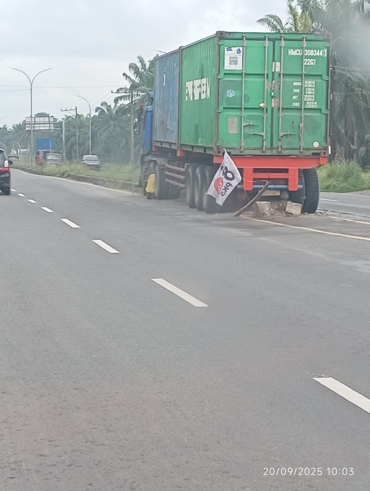 ‎TERITORIAL24.COM, SERDANG BEDAGAI-‎Sebuah truk kontainer mengalami insiden terperosok ke pembatas jalan di dekat pintu keluar Tol Teluk Mengkudu, Kabupaten Serdang Bedagai, Sumatera Utara, pada Sabtu (20/9/2025) pagi.