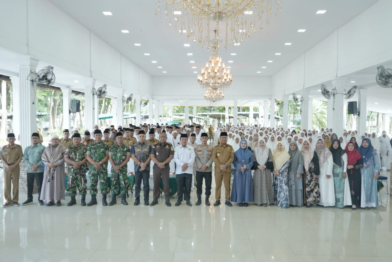 Wakil Bupati Asahan Rianto SH MAP berfoto bersama Forkopimda dan calon Jama'ah Haji Asahan dalam acara pembukaan Manasik Haji 1446 H di Pendopo Rumah Dinas Bupati Asahan, Selasa (06/05/2025).(gan).