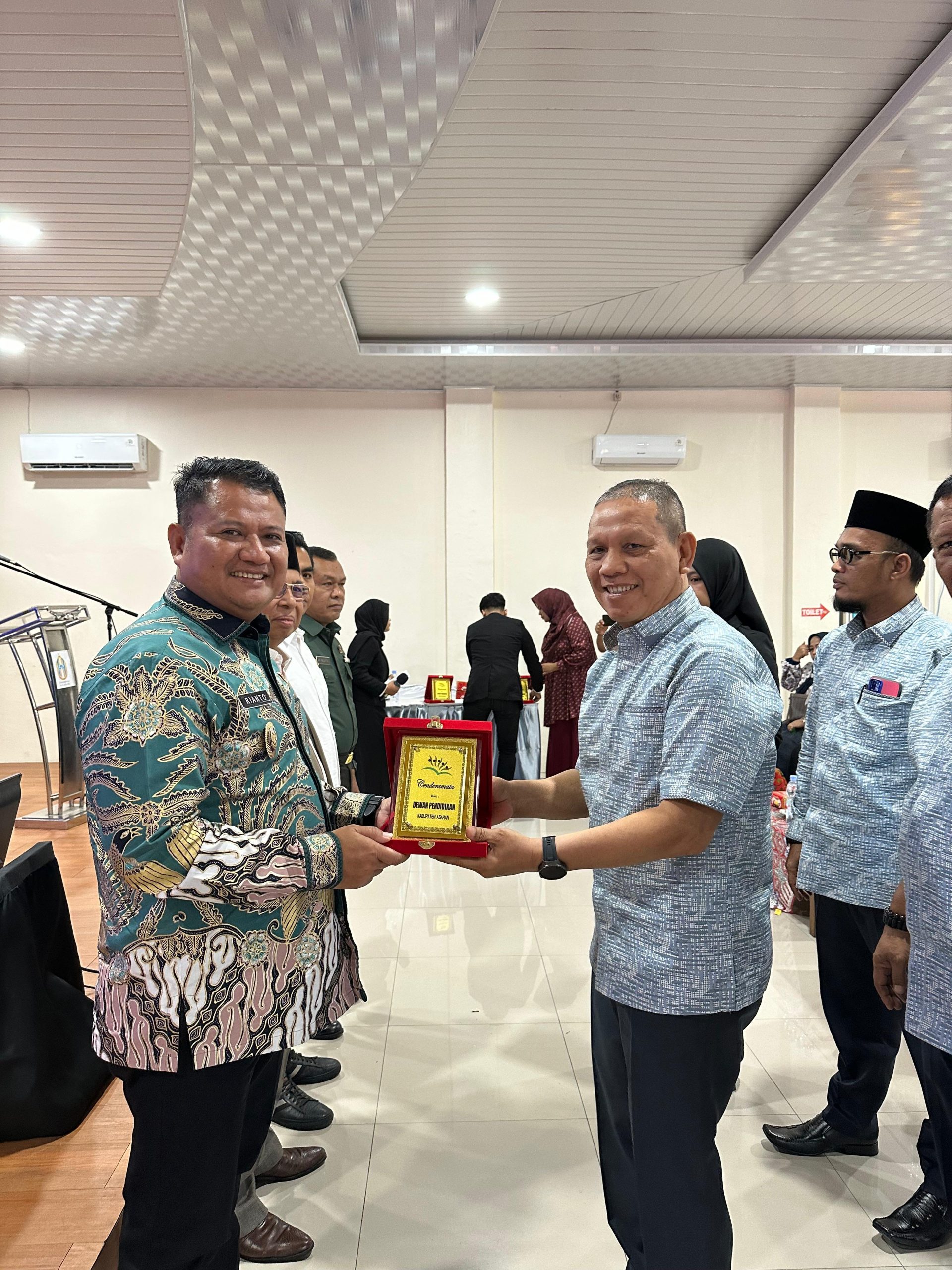 Ketua Yayasan Universitas Asahan Drs Mapilindo MPd menyerahkan cinderamata kepada Wakil Bupati Asahan Rianto, SH, MAP dalam seminar strategi penanggulangan geng motor di Aula Zulfirman Siregar Universitas Asahan, Kamis (19/06/2025). (gan).